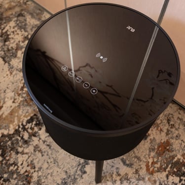 Bold and powerful , ORPHEUS stands out with its cylindrical black body wrapped in fabric , topped with sleek tempered glass , and supported by four solid legs for a strong, modern presence. It serves as a stylish audio centerpiece with charging convenience.